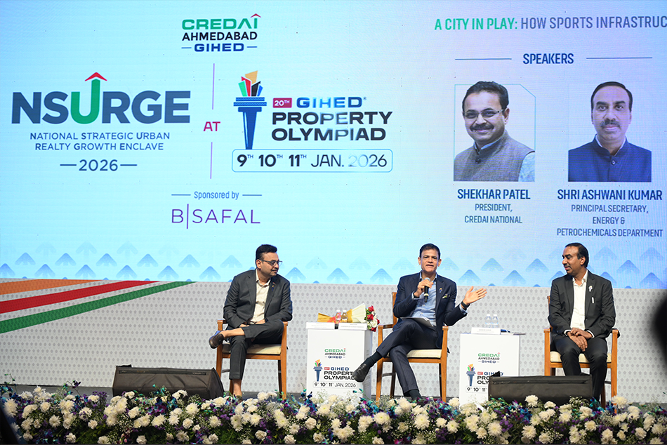 We were honored to kick off Session 1 of NSURGE 2026, where the conversation centered on the transformative power of sports infrastructure. The session featured an esteemed panel led by Chief Guest Ashwani Kumar, Principal Secretary of the Energy & Petrochemicals Department, who shared vital insights into the state's infrastructure roadmap. Adding to the depth of the discussion, Shekhar Patel, President of CREDAI National and MD & CEO of Ganesh Housing Limited, highlighted how mega-projects are positioning Ahmedabad as a global destination. The dialogue was masterfully moderated by Anuj Puri, Chairman of ANAROCK, who bridged the gap between policy and real estate reality. Together, they explored how our city is evolving into a powerhouse for both athletes and investors alike.